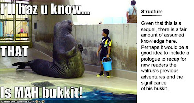 *Actually, none of us can ever remember suggesting a prologue – it mostly seems to work in the reverse. But the point stands.** (UPDATE) Thanks for the heads-up, Anonymous commenter! This brings up a lesson that is all too easy to learn the hard way: if you lose an author’s trust by making silly mistakes, like mixing up your flippered marine mammals, it’s very hard to convince them you know what you are talking about on the big stuff. Perhaps our structural note should have read: ‘Dear author, it is not clear how your protag shape-shifts from walrus to elephant seal and back again – seemingly at the drop of a bukkit.’ For further reading on this subject, I recommend www.walrusbucketsaga.com