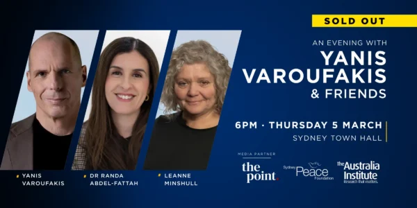 Join an evening with Yanis Varoufakis and friends, featuring Yanis Varoufakis, Dr Randa Abdel-Fattah and Leanne Minshull.