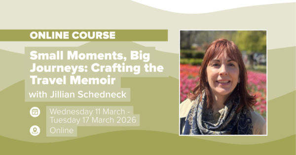 Join Jillian Schedneck for Small Moments, Big Journeys: Crafting the Travel Memoir, Wednesday 11 to Tuesday 17 March, 2026, online.